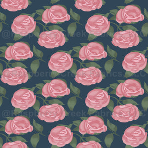 Textural hand painted pink rose garden with light pink roses and deep blue background