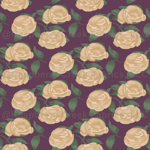 Textural hand painted yellow rose garden with yellow roses and deep burgundy red background