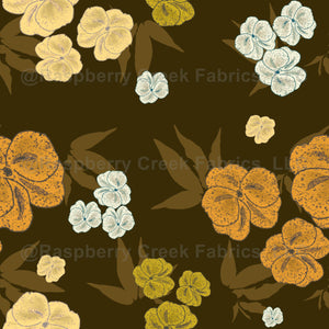 A floral pattern is spread across a brown background featuring clusters of flowers in shades of yellow, green, and light blue. Brown leaves accompany the blossoms, complementing the earthy tones.