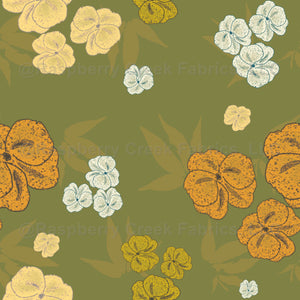 A seamless floral pattern features various flowers in shades of orange, yellow, and white scattered across a green background. The flowers are accompanied by subtle green leaves, creating a natural and harmonious design.