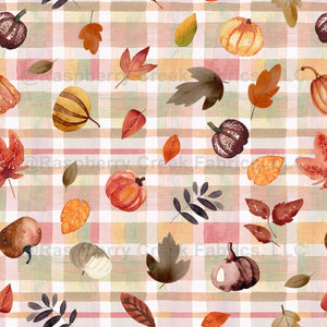 Festive and cozy pattern that features autumn leaves and pumpkins on a pastel colors checkered background. The pattern is hand-drawn and has a watercolor texture that adds a touch of warmth and charm. This pattern is perfect for thanksgiving decor and tablecloths