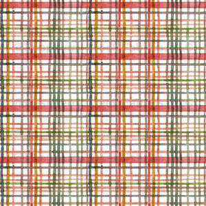 Festive plaid pattern that has a festive and cozy look with red, green, and yellow colors. The lines are not perfectly straight, giving it a hand-drawn and rustic feel. The white background makes the colors stand out and creates a contrast.