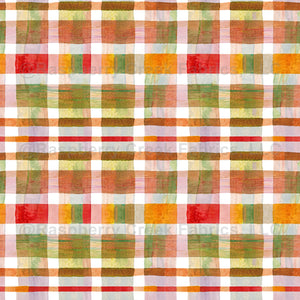 Festive and cozy pattern of watercolor brushstrokes in red, orange, green, and yellow. The brushstrokes form a gingham or plaid design that is perfect for the fall season and Thanksgiving decor. It has a textured and artistic look that adds warmth and charm to your projects. The background is white, which contrasts nicely with the vibrant colors. This pattern is ideal for creating a welcoming and cheerful atmosphere.