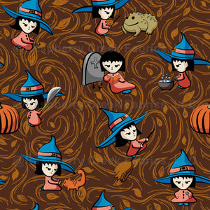 A cute little witch enjoying her day. She's reading by a tombstone, carving a pumpkin, playing with her pets, and cooking in her cauldron.