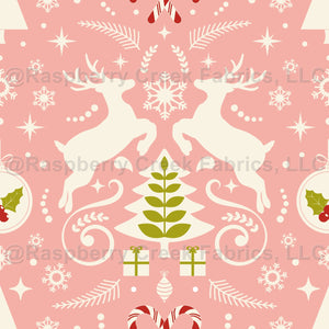 The Spirit of Christmas featuring reindeer, Christmas trees, presents, ornaments, holly, snowflakes, leaves, stars, and candy canes and pink background