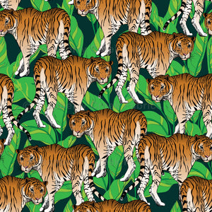 Hand drawn and digitally coloured tiger in a lush tropical jungle.