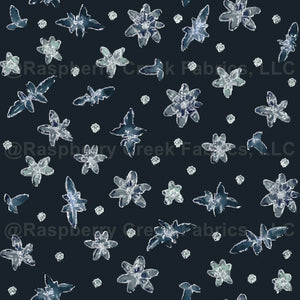 Tiny fall flowers and leaves with a few scattered dots create an interesting batik design on blue-black.