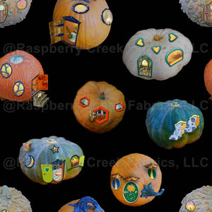 Beautifully furnished tiny pumpkin cottages created with different varieties of pumpkins create a whimsical fall design on black.
