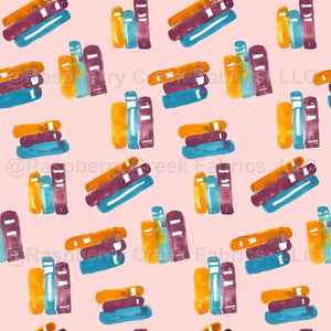 Orange books, blue books and red books stacked and tossed in light pink background