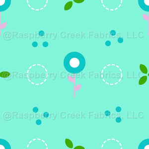 Tossed Floral on Aqua with Stitch Bubbles - HST Addict Collection - Large Low Density Lollipop Flowers- 30s Style Prints - Grass Green Light Blue Bubblegum Pink White