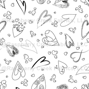 Tossed multidirectional Valentine hearts hand-drawn - love leverage collection- black white - Show your love for hearts, your friends, family, sewing, quilting, shopping, eating with whatever you make from the fabric