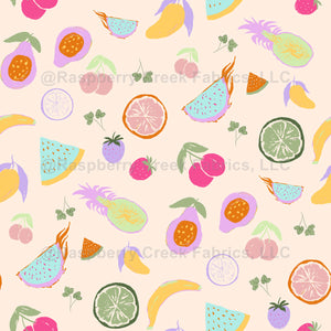 A versatile design with various summer fruits in tossed layout. Perfect for children's clothes, picnic blanket, or kitchen items.