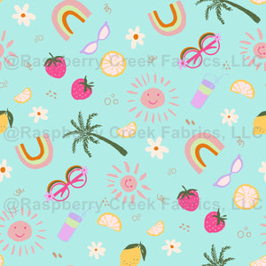 Tossed Sweet Summer with rainbows, sunshines, lemonade, sunglasses, palm tree, strawberries, floral, in vibrant background with a little bit of retro feel