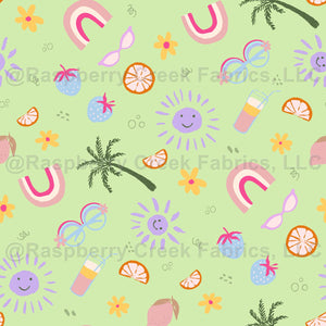 A versatile design with various summer fruits and items in tossed layout. Perfect for children's clothes, picnic blanket, or kitchen items.