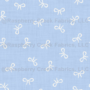 A soft, linen textured Carolina blue background features white, hand drawn coquette bows scattered across the surface, creating a playful and whimsical vibe. The pattern has a light and airy linen texture impression, suitable for girl's spaces and apparel