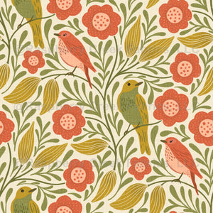 A textured design featuring birds and abstract flowers in a traditional style.