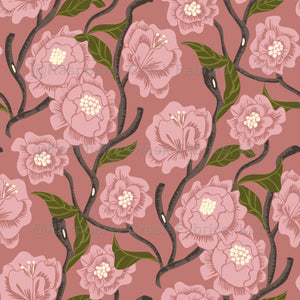 Hand-drawn trailing floral pattern with stylized pink flowers on a whimsical deep pink color background.