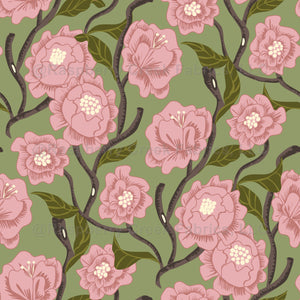 Trailing pink flowers floral on a whimsical green background, stylized trailing floral, green