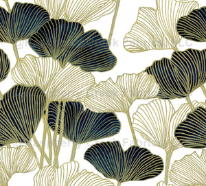 Leaves Collection: Hand-drawn ginkgo leaves in black and off-white with gold outlines and stems on a white background.