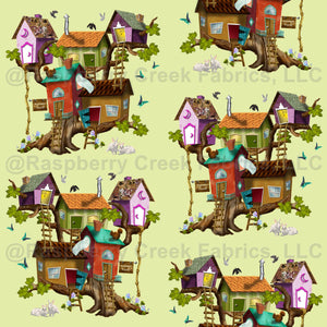 Whimsical treehouses create cozy homes for forest friends on butterfly green,