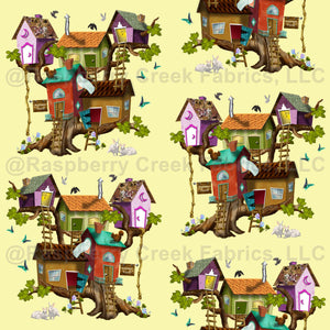 Whimsical treehouses create cozy homes for forest friends on lemon yellow.