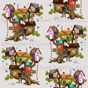 Whimsical treehouses create cozy homes for forest friends on warm silver.