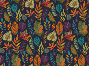 Leaves Collection: Autumn leaves in various shapes in purple, green, orange, blue, yellow, brown, tan and a navy background.