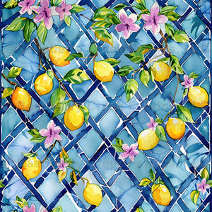 Lemons and florals climb a watercolor trellis in this dreamy coastal print, perfect for summer spaces, resort wear, and sunny escapes.