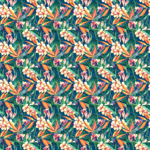 Tropical Collection: An island rainforest of thick green leaves, orange bird of paradise and white hibiscus flowers in watercolor.