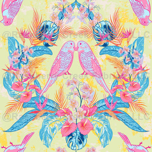 Taking a different approach of tropical foliage in a damask layout. Bright, fun, happy color palette brings the tropical vibe with the love birds (parakeets) in the center.