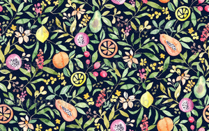 Hand-painted watercolor tropical fruit and leaves on a dark background.