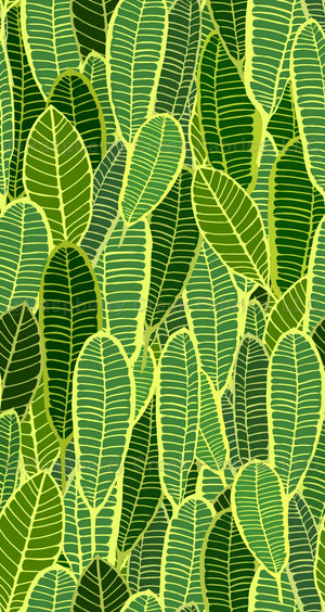All-over pattern of overlapping tropical leaves with a variety of warm and cool greens.