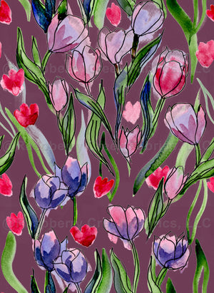 This expressive tulip pattern combines fluid watercolor shapes with dynamic ink lines, creating a lively composition full of movement and contrast. The amaranth background enhances the richness of the pink, lilac, and violet blooms, while the greens add a natural rhythm to the design. Inspired by spring rebirth and artistic freedom, this handmade pattern celebrates both elegance and spontaneity — perfect for fashion textiles and modern interiors.