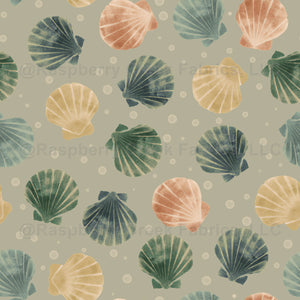 Watercolor scallop shells in vintage green, punctuated by delicate bubbles, creates a serene atmosphere.