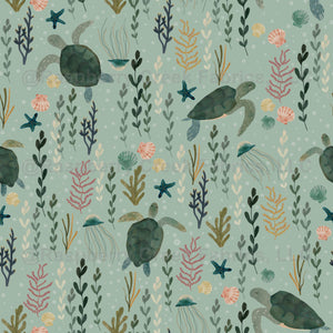 Watercolor pattern showcasing sea turtles, playful bubbles, and floating seaweed over a blue background
