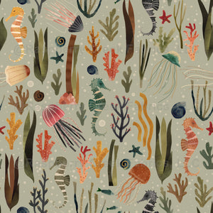 Watercolor pattern featuring seahorses, seaweed and other creatures in the coral reef over a vintage green background