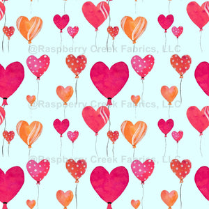 Valentines Collection: Red, orange and pink heart shaped balloons floating into the blue sky with polka dots, stripes and plain.