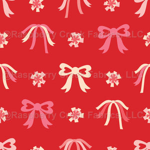 Valentine's Day Ribbons, Bows and PomPoms in Cream and Pink on Red, Retro