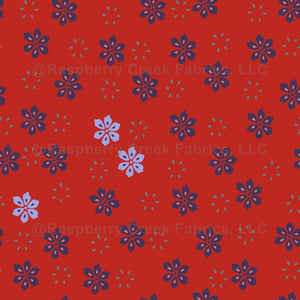 Small purple flowers dotted on a red poppy background. With contrasting colors. Suitable for dresses, shirts and children's clothing. Also for Christmas. This fabric is available in three colors: poppy red, blueberry purple, and coral.