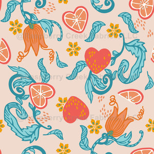 Fabrics in pastel tones for a modern and cozy style. For Valentine's Day, an assortment of fruit in the shape of a heart, a sort of succulent strawberries, cut into quarters. Available in four colors. Assorted to the Valentine's flowers fabrics.