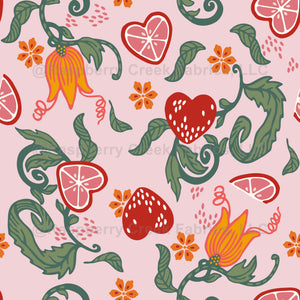 For Valentine's Day, an assortment of fruit in the shape of a heart, a sort of succulent strawberries, cut into quarters. Available in four colors. Assorted to the Valentine's flowers fabrics.