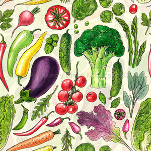 Hand drawn watercolor and ink various vegetables and herbs, seamless pattern design