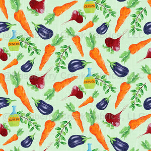 Hand-painted vegetable pattern with carrots, eggplants, radishes, olive oil, and olive branches in a vibrant Mediterranean style.