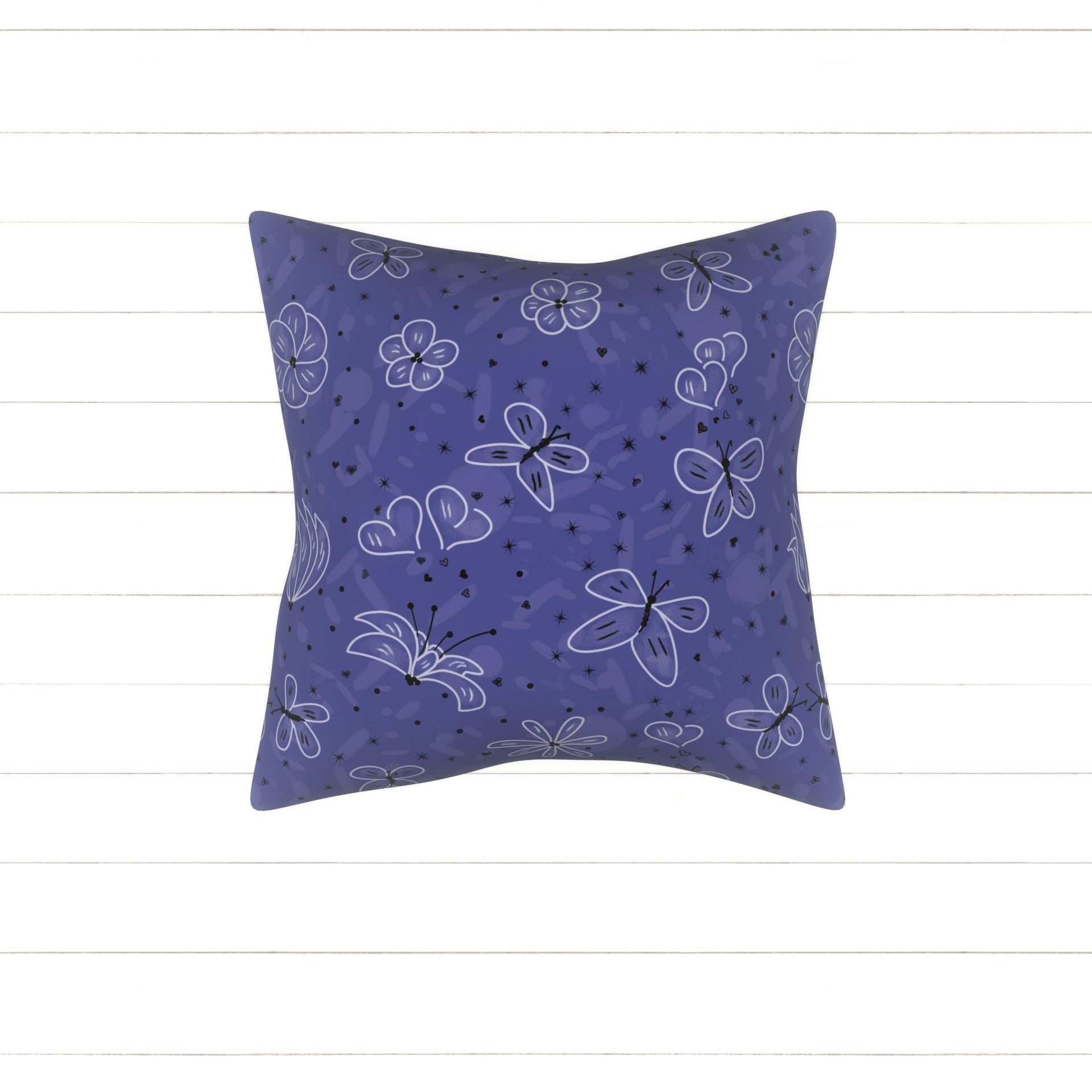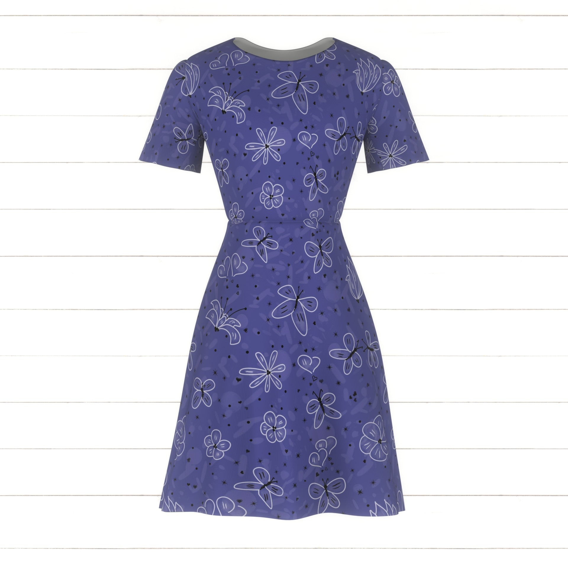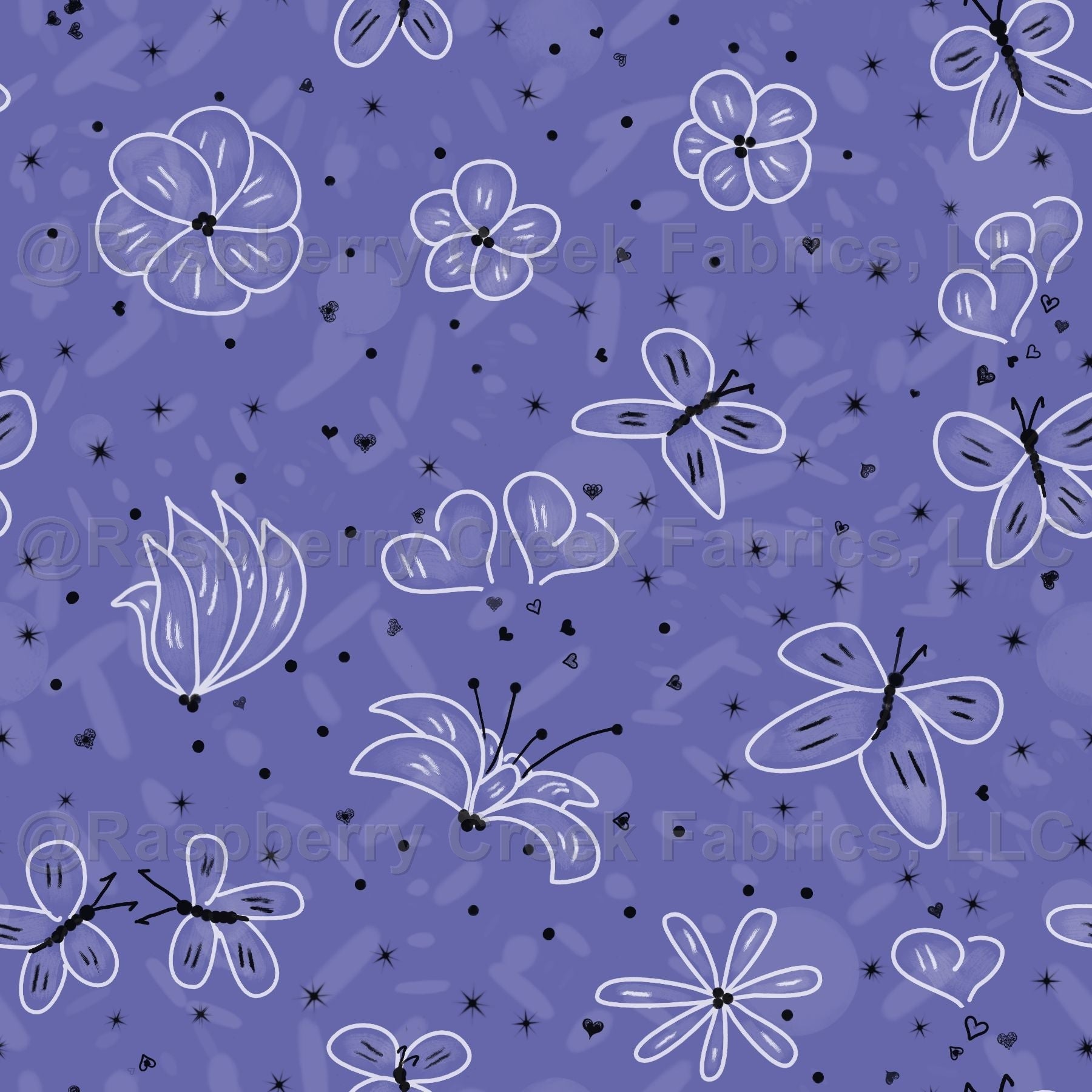 Simple seamless pattern of cute little stars, hearts, flowers, and fluttering butterflies, set on a lavender, Very Peri background. This pattern is also available in violet mauve, and with and without the word 'love' written in little hearts.