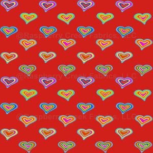 A heartfelt pattern of multicolored hearts in a ditsy print against a red background. Perfect for Valentine's Day or Spring Projects.