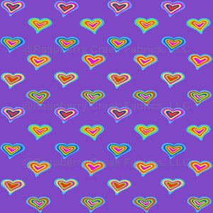 A heartfelt pattern featuring vibrant multicolored hearts in a ditsy print against a purple background. Perfect for Valentine's Day or Spring Projects.