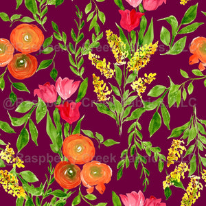 A lively floral pattern featuring hand-painted orange ranunculus, pink tulips, and lush green foliage on a purple magenta background. Brings a touch of nature-inspired elegance to any project