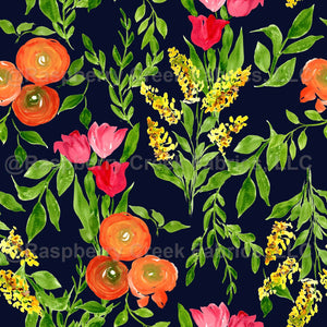 A lively floral pattern featuring hand-painted orange ranunculus, pink tulips, and lush green foliage on a dark blue background. Brings a touch of nature-inspired elegance to any project