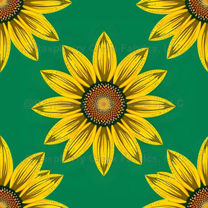 Bold and striking pattern of large, detailed sunflowers against a rich green background. The sunflowers are rendered in vibrant yellow with intricately designed centers featuring brown and gold tones. The style of the illustration is semi-realistic with a graphic quality, emphasizing the geometric nature of the sunflower's petal arrangement.