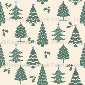 Sweet and nostalgic pattern of assorted Christmas trees and trimmings. Muted sage green, ivory, and pops of teal.